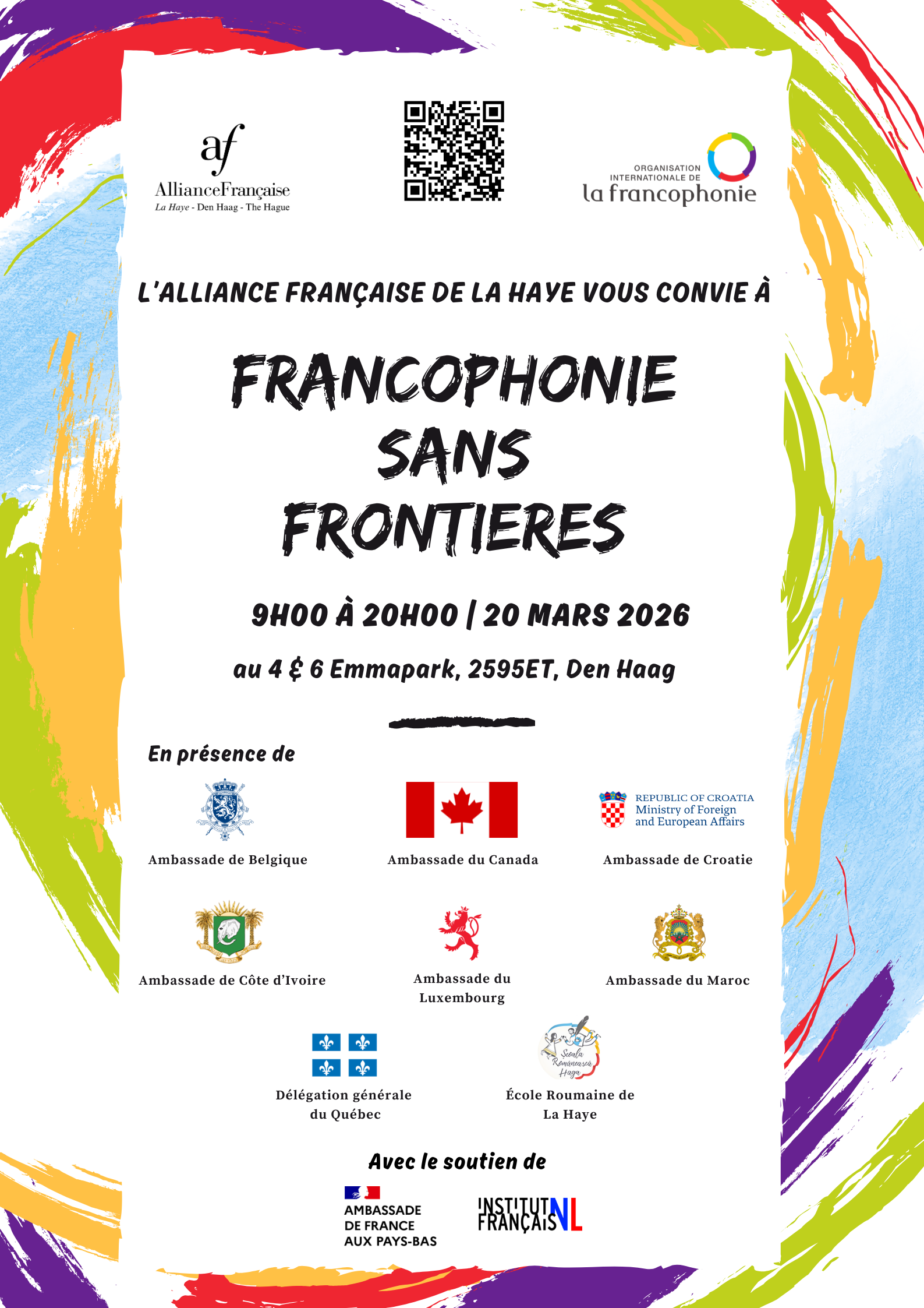 Le 20 mars 2026, rejoignez-nous pour célébrer une Francophonie vivante, plurielle et sans frontières. Nous vous attendons nombreux à l’Alliance Française de La Haye ! 🌍✨