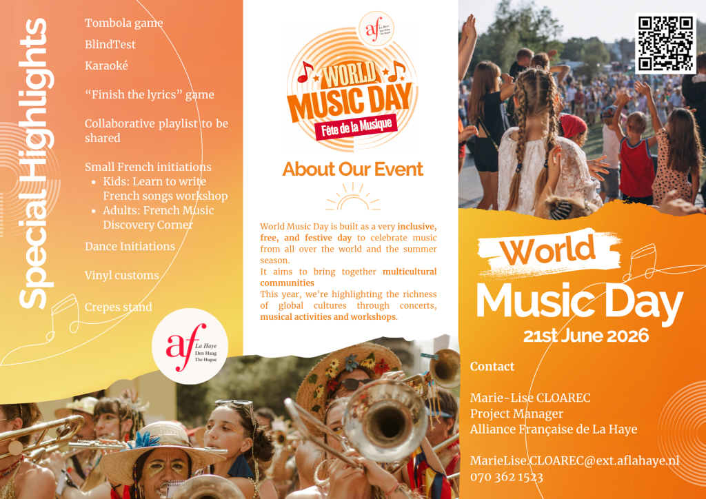 Le 21 juin 2026, laissez-vous emporter par la magie de la Fête de la Musique à La Haye, un événement unique où les mélodies du monde entier se rencontreront sous le thème « When Music Meets Cultures ». Organisée par l’Alliance Française de La Haye, cette journée festive célèbrera la diversité musicale, l’inclusivité, le début de l’été et la joie de partager des rythmes venants des quatre coins de la planète.